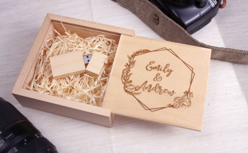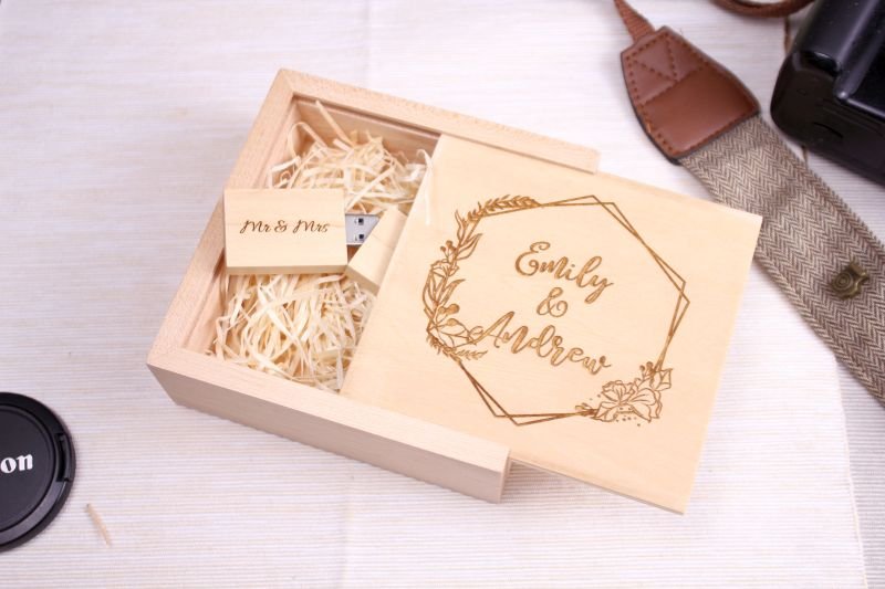 This personalised wooden trinket box with personalised usb stick for photographers is the perfect way to showcase your professionalism. It has a premium maple wood feel and the deep engraved surface with ready made designs or your custom logo branded printed on boxes that acts as a testament to your creative skill.
