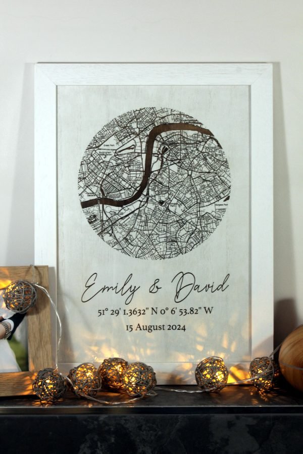 Featuring beautiful detailed engraving of your chosen location, you can customize it to include personal messages, GPS coordinates, and dates. Our Engraved Wooden Map can display any location of your choice with a heart pin. Available in A4 or A3 sizes with three different picture frame colour to choose from, show off your love for a special place in style! With Engraved Wooden Map, make your home truly one-of-a-kind.